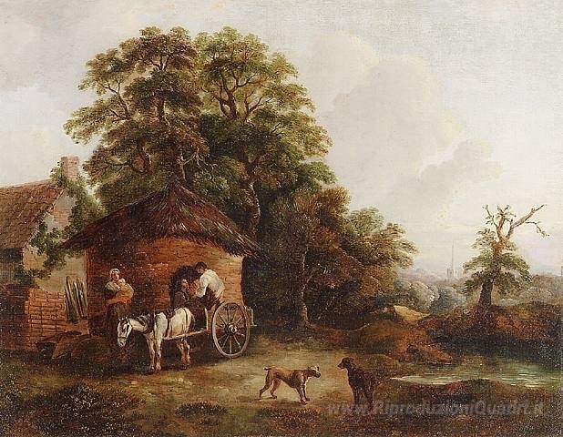 Ti offriamo una riproduzione artigianale su tela dell'opera famosa 'Cottage nel Surrey' di George Morland, dal Museo delle Riproduzioni.