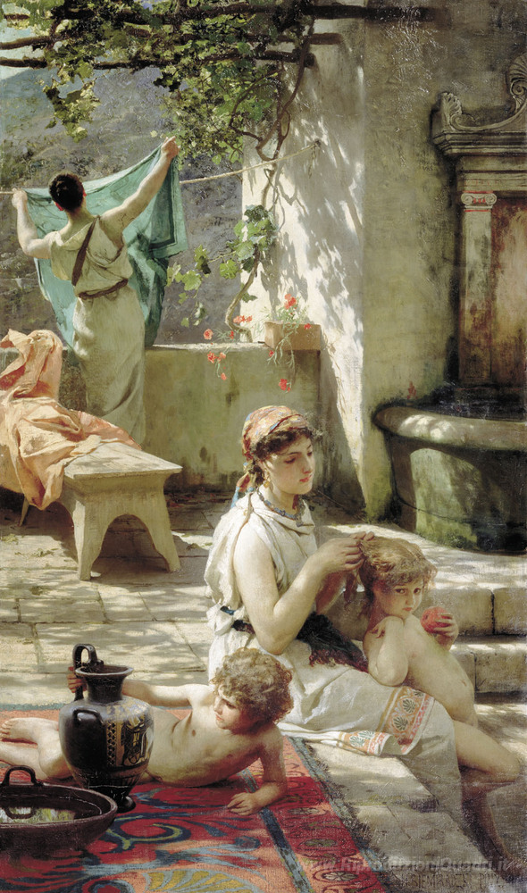 Realizzato con tecniche pittoriche raffinate, Da un pool non è solo un'opera d'arte, ma un pezzo di storia che arricchisce qualsiasi ambiente. L'equilibrio tra soggetto e sfondo esalta l'eleganza degli spazi, trasformandoli in luoghi di contemplazione e ispirazione. Aggiungi questo straordinario dipinto al tuo arredamento e permetti che la magia di Siemiradzki plasmi la tua casa con una bellezza senza tempo.
