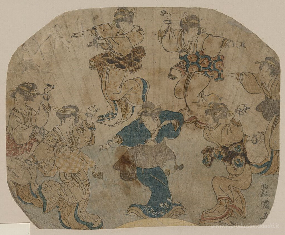 Ti offriamo una riproduzione artigianale su tela dell'opera famosa 'Danza' di Utagawa Toyokuni, dal Museo delle Riproduzioni.