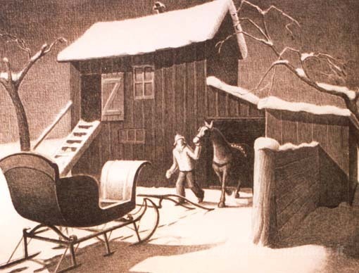 Ti offriamo una riproduzione artigianale su tela dell'opera famosa 'Dicembre Pomeriggio' di Grant Wood, dal Museo delle Riproduzioni.