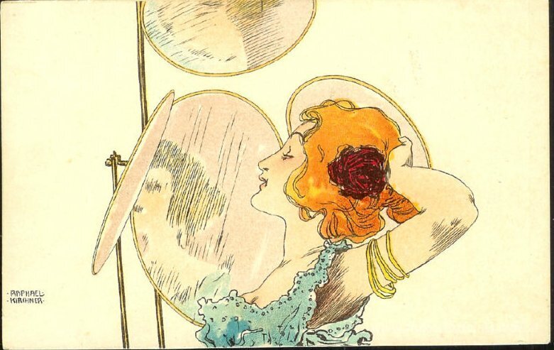 Ti offriamo una riproduzione artigianale su tela dell'opera famosa 'Dietro le quinte' di Raphael Kirchner, dal Museo delle Riproduzioni.