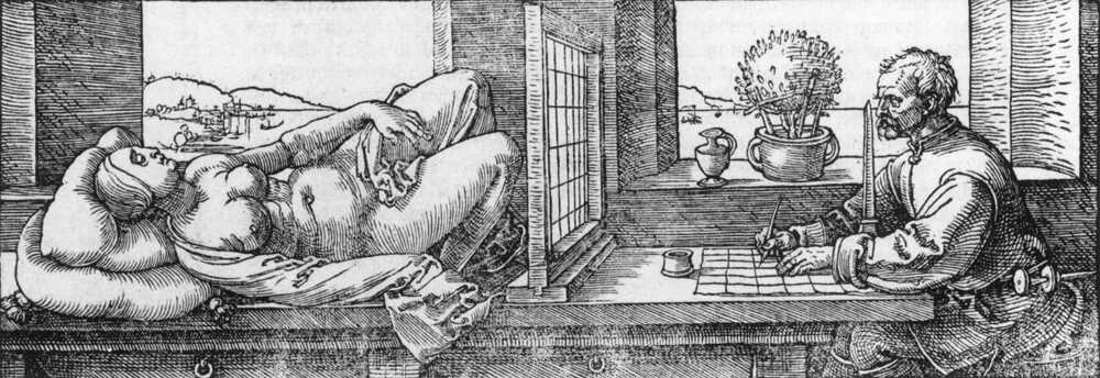 Ti offriamo una riproduzione artigianale su tela dell'opera famosa 'Disegnatore Disegnare un Recumbent Donna' di Albrecht Durer, dal Museo delle Riproduzioni.