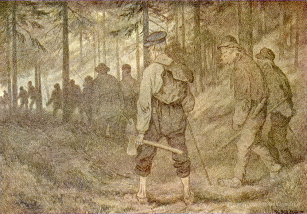 Ti offriamo una riproduzione artigianale su tela dell'opera famosa 'Dodici uomini nella foresta' di Theodor Severin Kittelsen, dal Museo delle Riproduzioni.