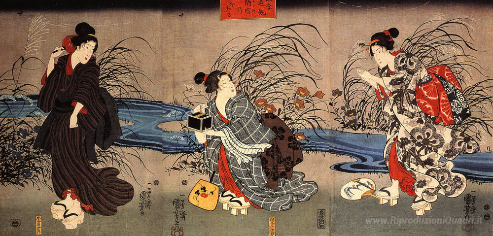 Ti offriamo una riproduzione artigianale su tela dell'opera famosa 'Donna che cattura lucciola da un torrente' di Utagawa Kuniyoshi, dal Museo delle Riproduzioni.