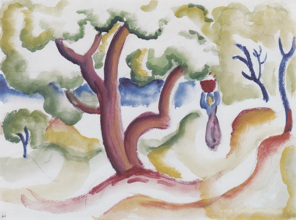 Ti offriamo una riproduzione artigianale su tela dell'opera famosa 'Donna con brocca sotto gli alberi' di August Macke, dal Museo delle Riproduzioni.