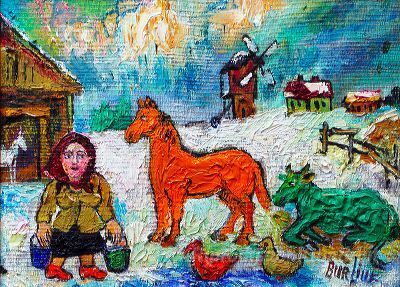 Ti offriamo una riproduzione artigianale su tela dell'opera famosa 'Donna con due secchi' di David Burliuk, dal Museo delle Riproduzioni.