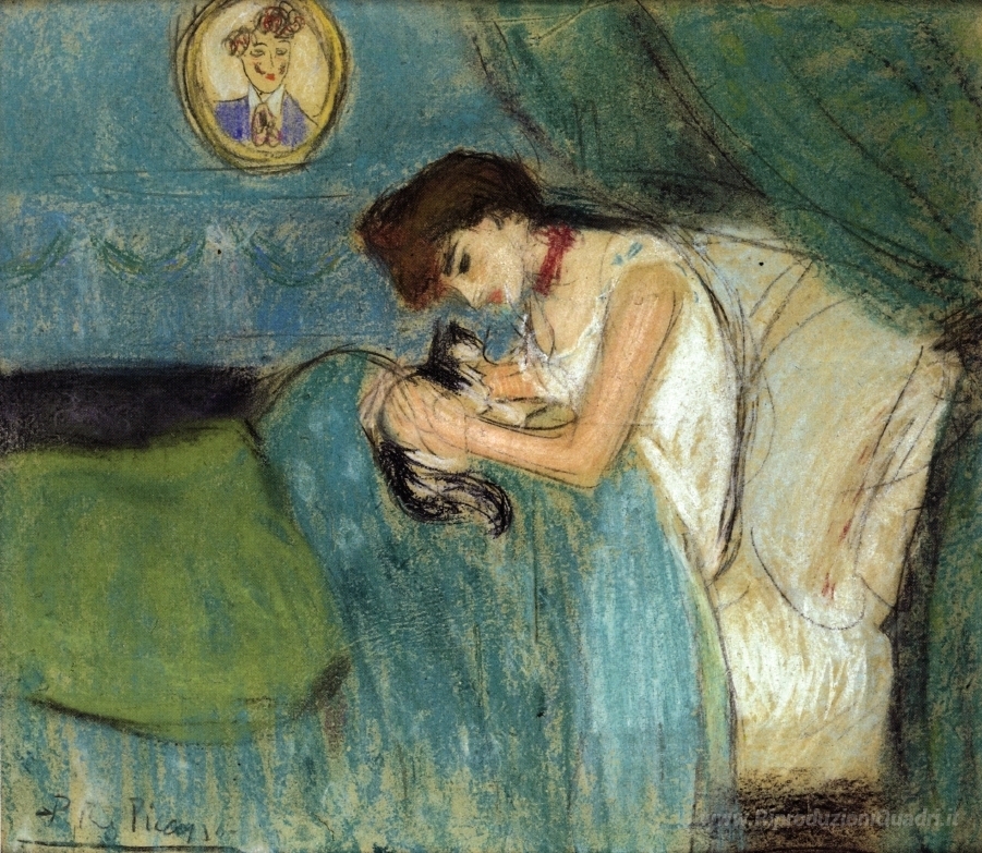 Ti offriamo una riproduzione artigianale su tela dell'opera famosa 'Donna con gatto' di Pablo Picasso, dal Museo delle Riproduzioni.