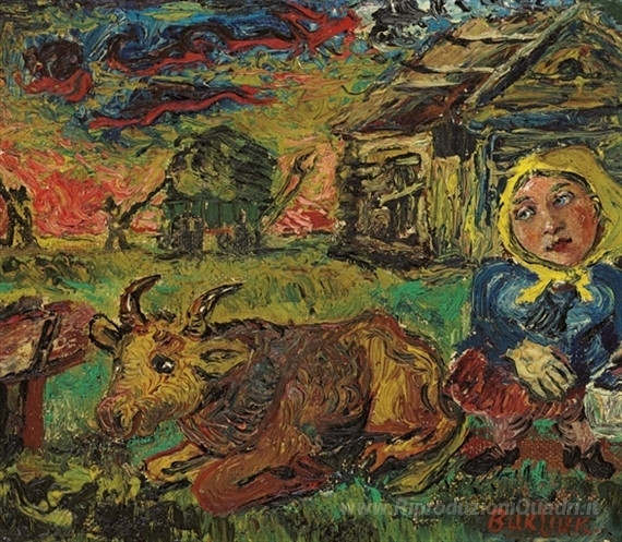 Ti offriamo una riproduzione artigianale su tela dell'opera famosa 'Donna con la sciarpa gialla e mucca' di David Burliuk, dal Museo delle Riproduzioni.