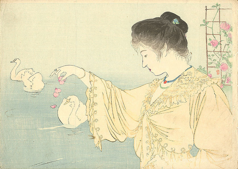 Ti offriamo una riproduzione artigianale su tela dell'opera famosa 'Donna e bianchi cigni' di Kiyokata Kaburagi, dal Museo delle Riproduzioni.