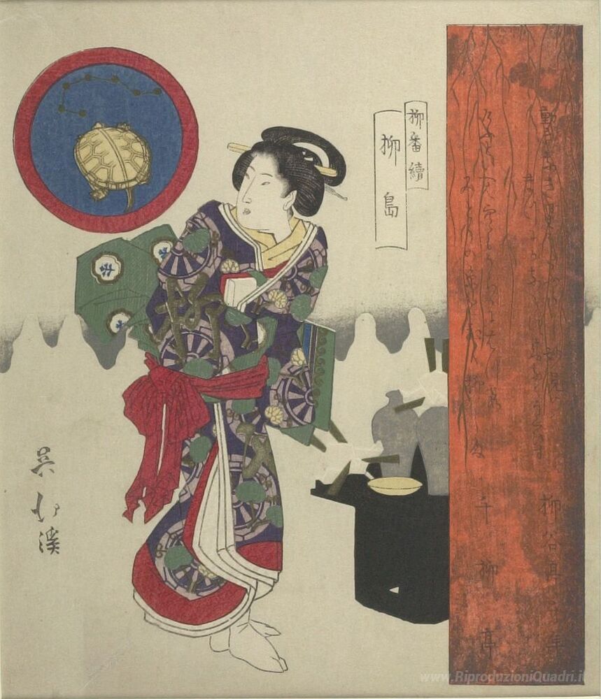 Ti offriamo una riproduzione artigianale su tela dell'opera famosa 'Donna in piedi da lacca vassoio con Sake' di Toyota Hokkei, dal Museo delle Riproduzioni.