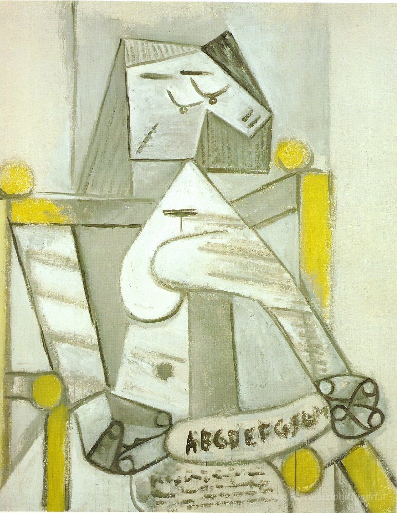 Ti offriamo una riproduzione artigianale su tela dell'opera famosa 'Donna seduta con il libro di ortografia' di Pablo Picasso, dal Museo delle Riproduzioni.