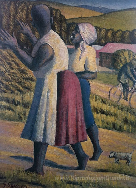 Ti offriamo una riproduzione artigianale su tela dell'opera famosa 'DONNE NEL PAESE' di Gerard Sekoto, dal Museo delle Riproduzioni.