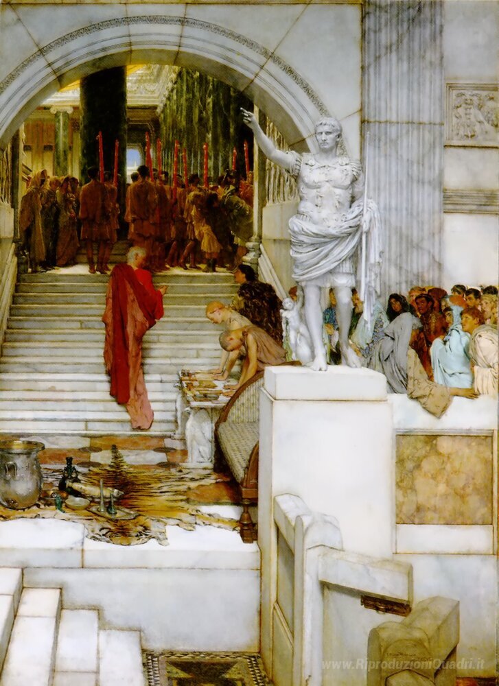 Ti offriamo una riproduzione artigianale su tela dell'opera famosa 'Dopo l'udienza' di Sir Lawrence Alma-Tadema, dal Museo delle Riproduzioni.
