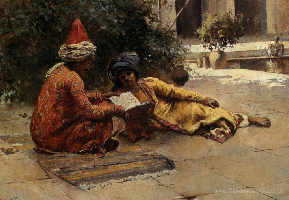 Ti offriamo una riproduzione artigianale su tela dell'opera famosa 'Due arabi Reading' di Edwin Lord Weeks, dal Museo delle Riproduzioni.