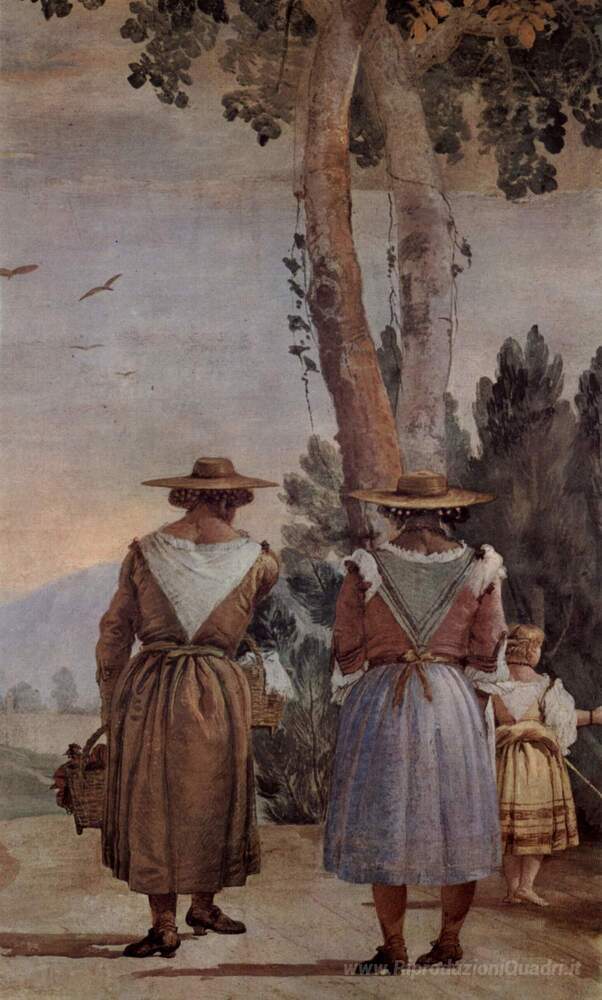 Ti offriamo una riproduzione artigianale su tela dell'opera famosa 'Due Contadino donne e un bambino visto da dietro, dal 'Foresteri' di Giovanni Domenico Tiepolo, dal Museo delle Riproduzioni.