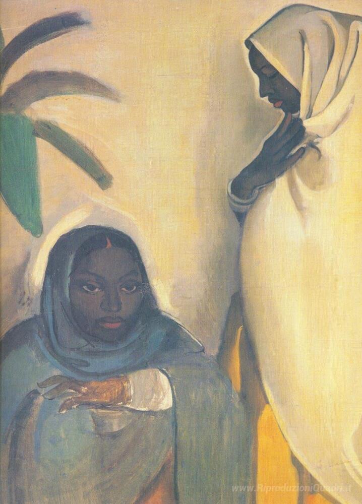 Ti offriamo una riproduzione artigianale su tela dell'opera famosa 'Due Donne' di Amrita Sher-Gil, dal Museo delle Riproduzioni.