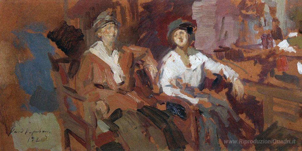 Ti offriamo una riproduzione artigianale su tela dell'opera famosa 'Due in una sedia' di Konstantin Korovin, dal Museo delle Riproduzioni.