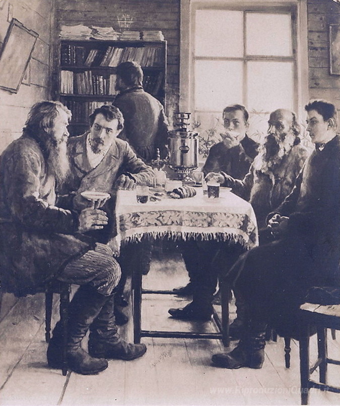 Ti offriamo una riproduzione artigianale su tela dell'opera famosa 'Durante una visita al Maestro' di Nikolay Bogdanov-Belsky, dal Museo delle Riproduzioni.