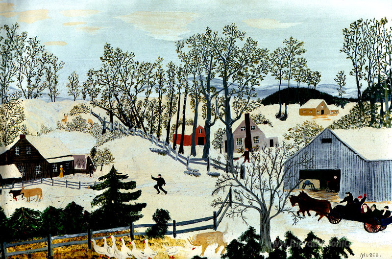 Ti offriamo una riproduzione artigianale su tela dell'opera famosa 'Early primavera on the Farm' di Grandma Moses, dal Museo delle Riproduzioni.