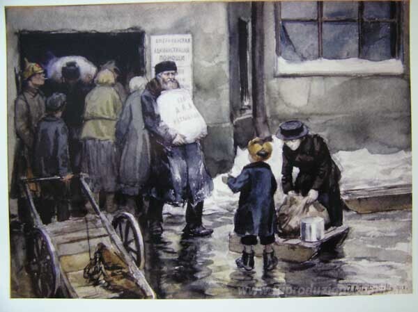 Ti offriamo una riproduzione artigianale su tela dell'opera famosa 'Emissione di pane' di Ivan Vladimirov, dal Museo delle Riproduzioni.