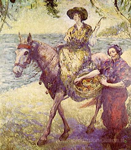 Ti offriamo una riproduzione artigianale su tela dell'opera famosa 'En la playa de Macuto' di Andres de Santa Maria, dal Museo delle Riproduzioni.