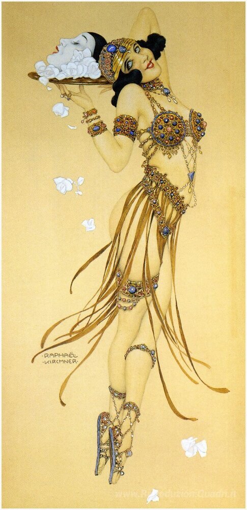 Ti offriamo una riproduzione artigianale su tela dell'opera famosa 'Espiazione' di Raphael Kirchner, dal Museo delle Riproduzioni.