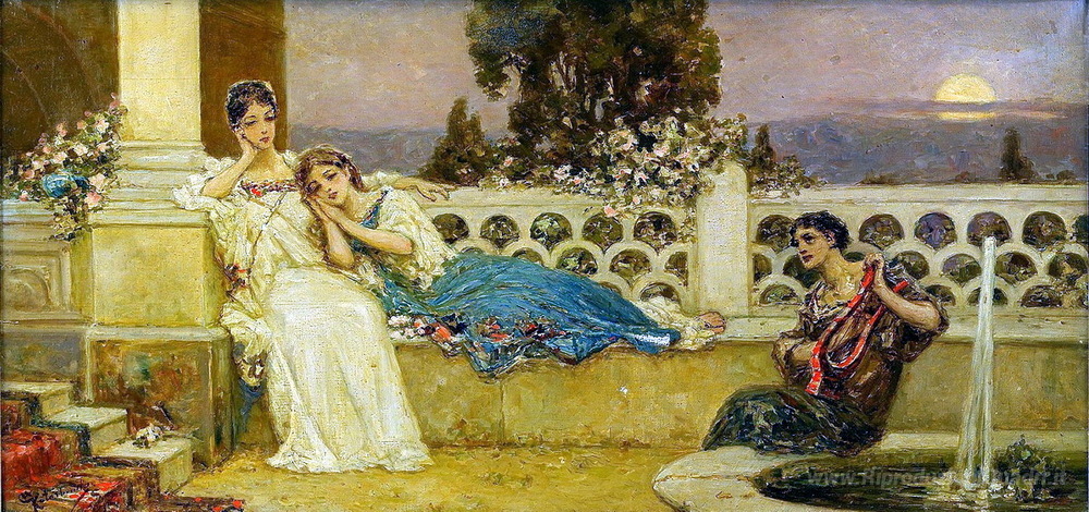 Ti offriamo una riproduzione artigianale su tela dell'opera famosa 'Eveneing presso la Terrazza' di Wilhelm Kotarbinski, dal Museo delle Riproduzioni.