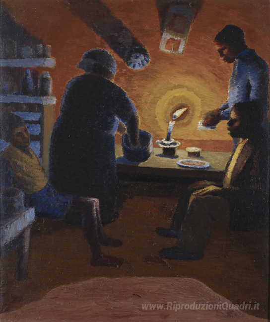 Ti offriamo una riproduzione artigianale su tela dell'opera famosa 'Famiglia con candela' di Gerard Sekoto, dal Museo delle Riproduzioni.
