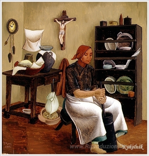 Ti offriamo una riproduzione artigianale su tela dell'opera famosa 'Fare Formaggio' di Ivan Generalic, dal Museo delle Riproduzioni.