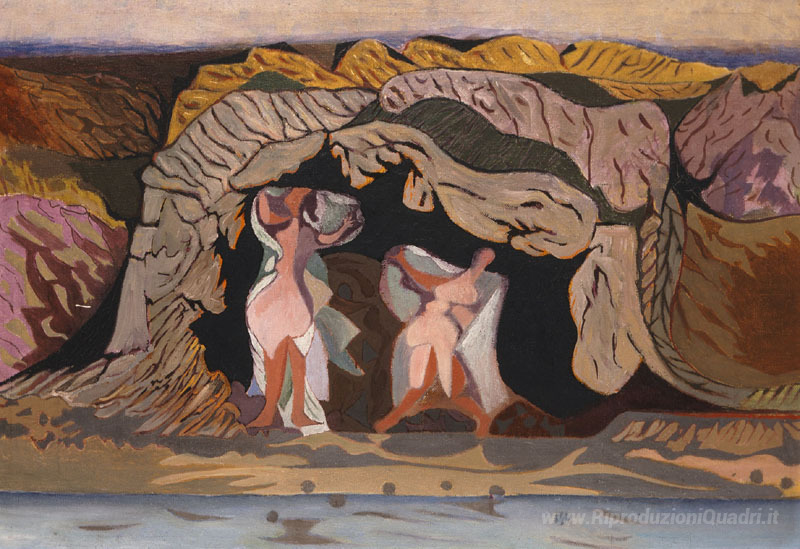 Ti offriamo una riproduzione artigianale su tela dell'opera famosa 'Fare il bagno nella grotta' di Nikos Hadjikyriakos-Ghikas, dal Museo delle Riproduzioni.