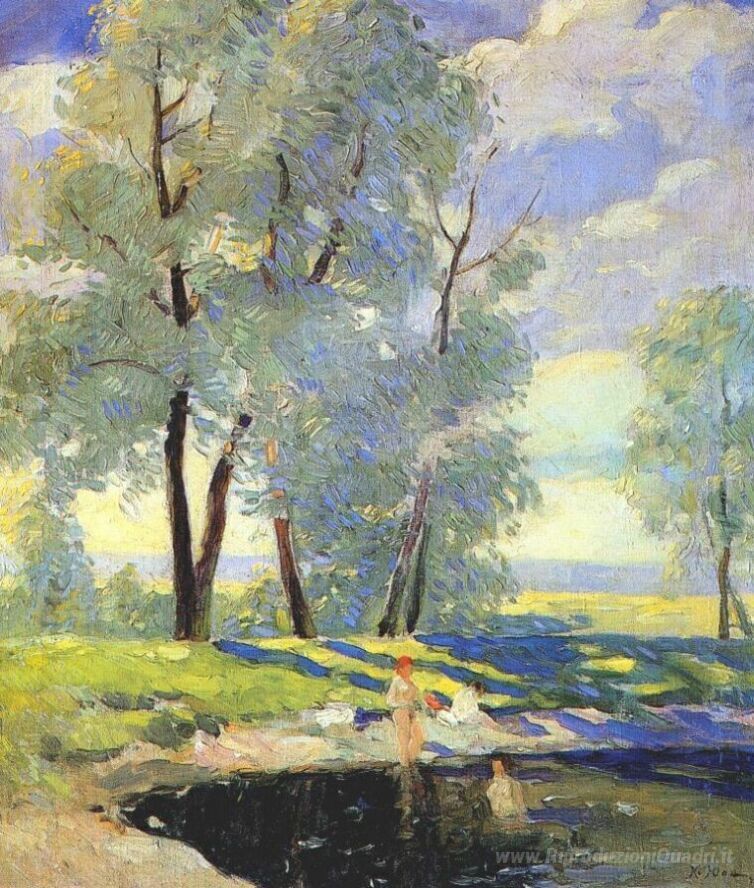 Ti offriamo una riproduzione artigianale su tela dell'opera famosa 'Fare il bagno' di Konstantin Yuon, dal Museo delle Riproduzioni.
