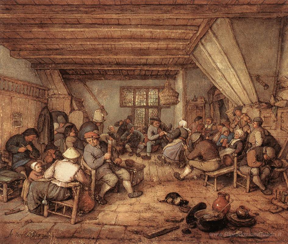 Ti offriamo una riproduzione artigianale su tela dell'opera famosa 'Festa Contadini in una taverna' di Adriaen van Ostade, dal Museo delle Riproduzioni.