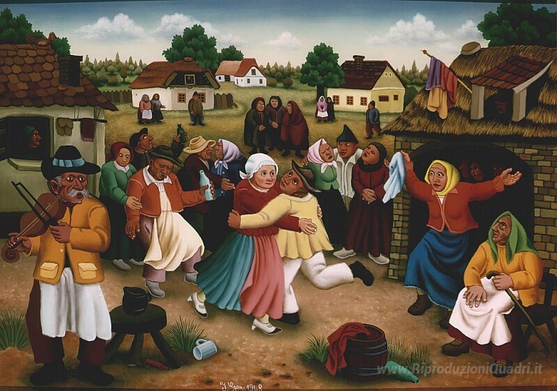 Ti offriamo una riproduzione artigianale su tela dell'opera famosa 'Festa in giardino' di Ivan Generalic, dal Museo delle Riproduzioni.