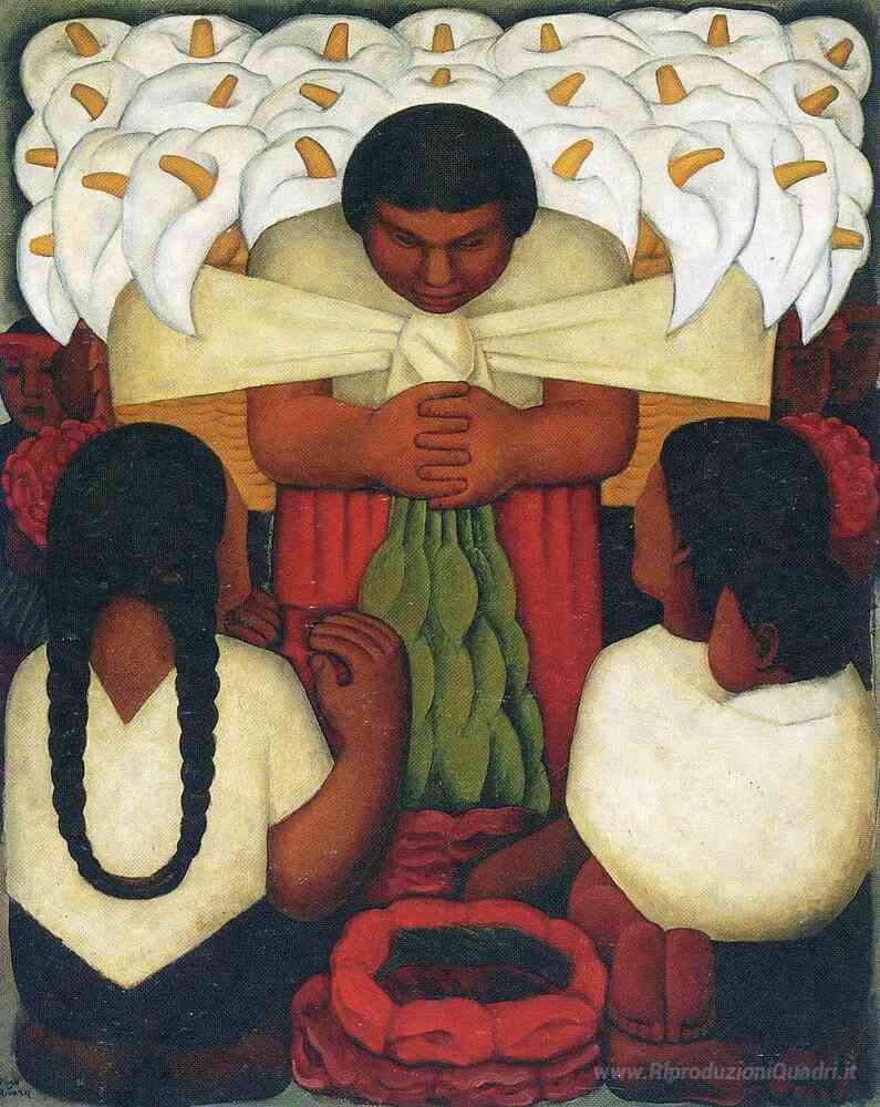 Ti offriamo una riproduzione artigianale su tela dell'opera famosa 'Festival dei Fiori' di Diego Rivera, dal Museo delle Riproduzioni.