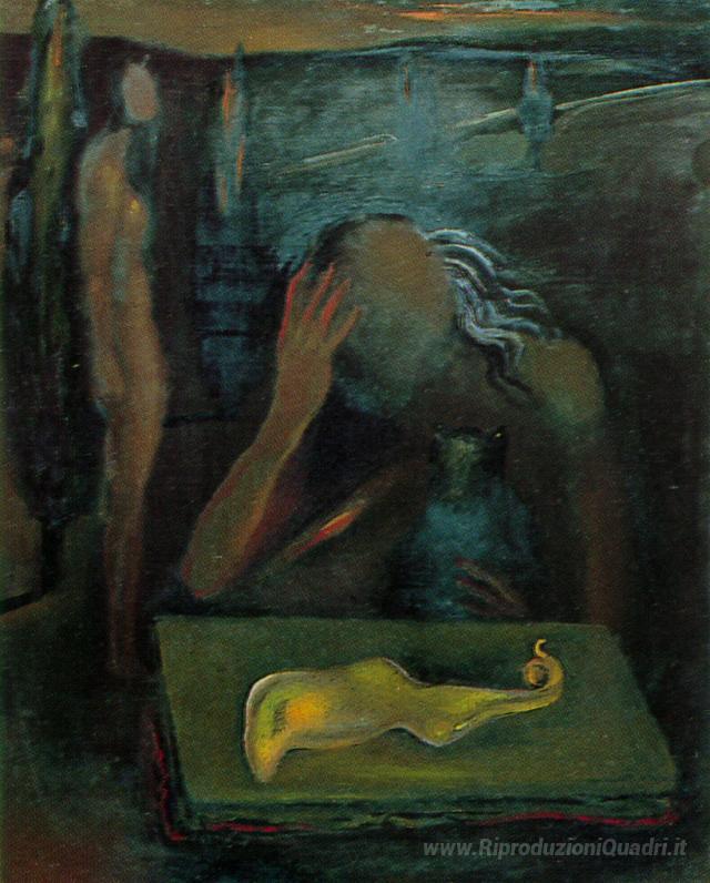 Ti offriamo una riproduzione artigianale su tela dell'opera famosa 'Figura seduta Contemplando un 'Grande Masturbatore tenia'' di Salvador Dali, dal Museo delle Riproduzioni.