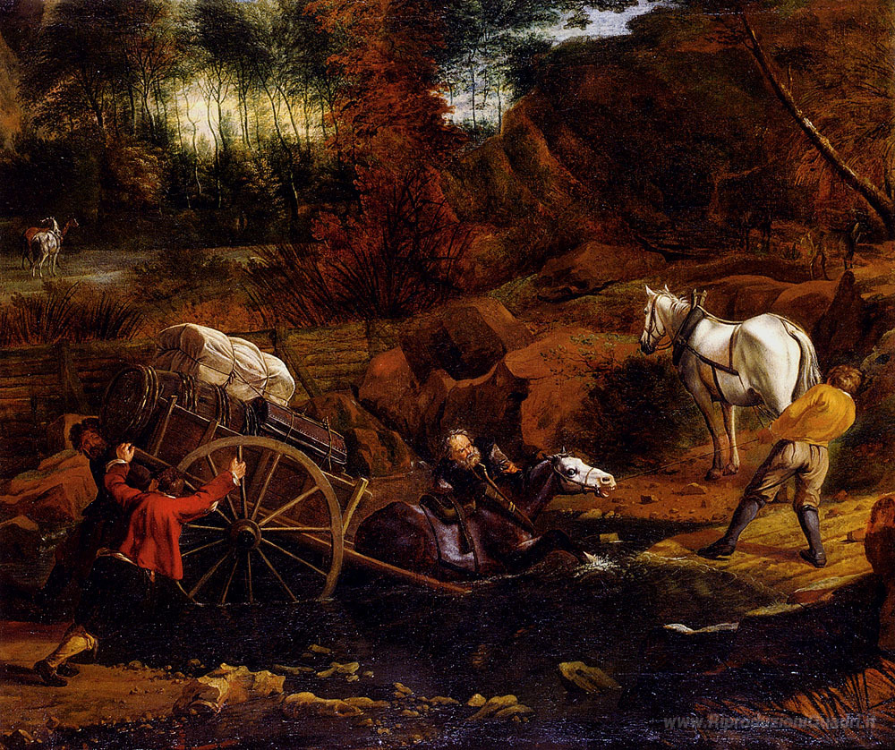 Ti offriamo una riproduzione artigianale su tela dell'opera famosa 'Figure con un carrello e Cavalli guado Un flusso' di Jan Siberechts, dal Museo delle Riproduzioni.