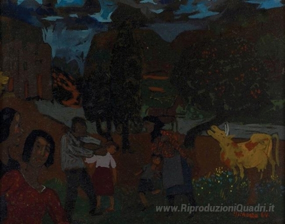 Ti offriamo una riproduzione artigianale su tela dell'opera famosa 'Figure nel villaggio' di Grégoire Michonze, dal Museo delle Riproduzioni.