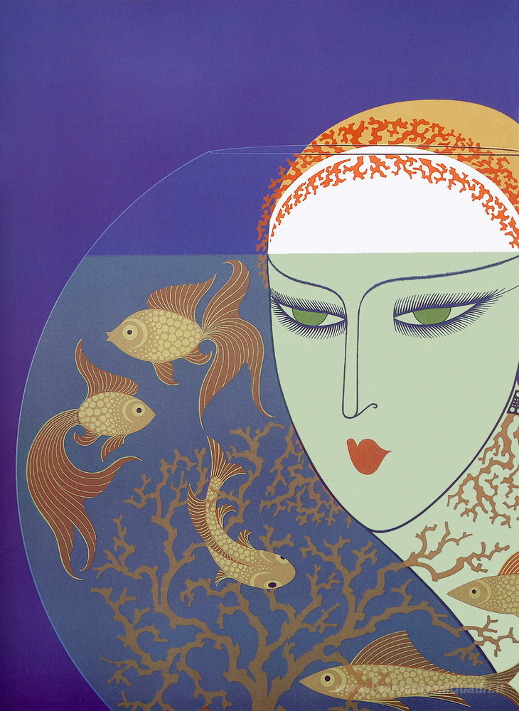 Ti offriamo una riproduzione artigianale su tela dell'opera famosa 'Fish Bowl' di Erte, dal Museo delle Riproduzioni.