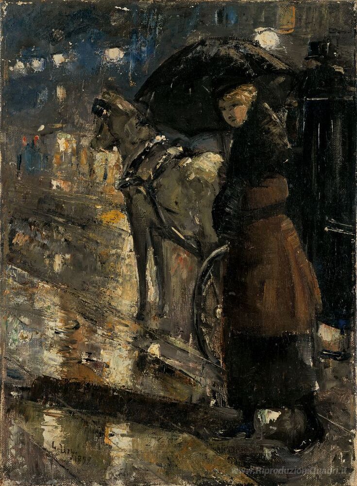 Ti offriamo una riproduzione artigianale su tela dell'opera famosa 'Frau und Droschke' di Lesser Ury, dal Museo delle Riproduzioni.