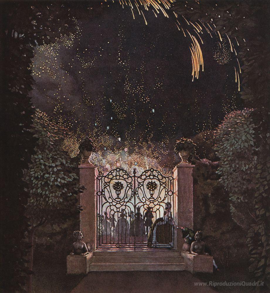 Ti offriamo una riproduzione artigianale su tela dell'opera famosa 'Fuochi d'artificio nel Parco' di Konstantin Somov, dal Museo delle Riproduzioni.