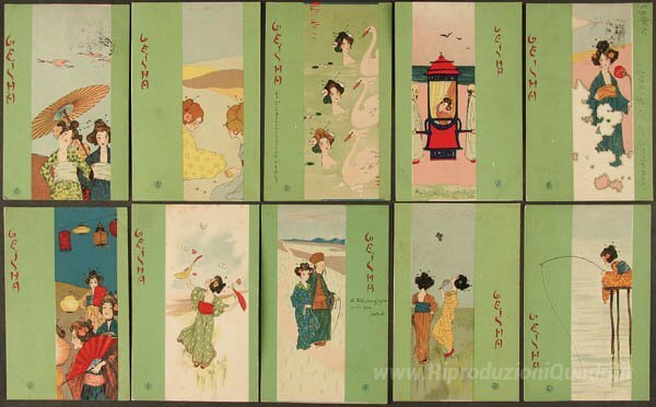 Ti offriamo una riproduzione artigianale su tela dell'opera famosa 'Geisha, verde' di Raphael Kirchner, dal Museo delle Riproduzioni.