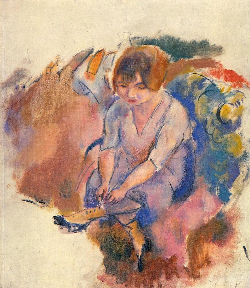 Ti offriamo una riproduzione artigianale su tela dell'opera famosa 'Giovane donna che mette le calze' di Jules Pascin, dal Museo delle Riproduzioni.
