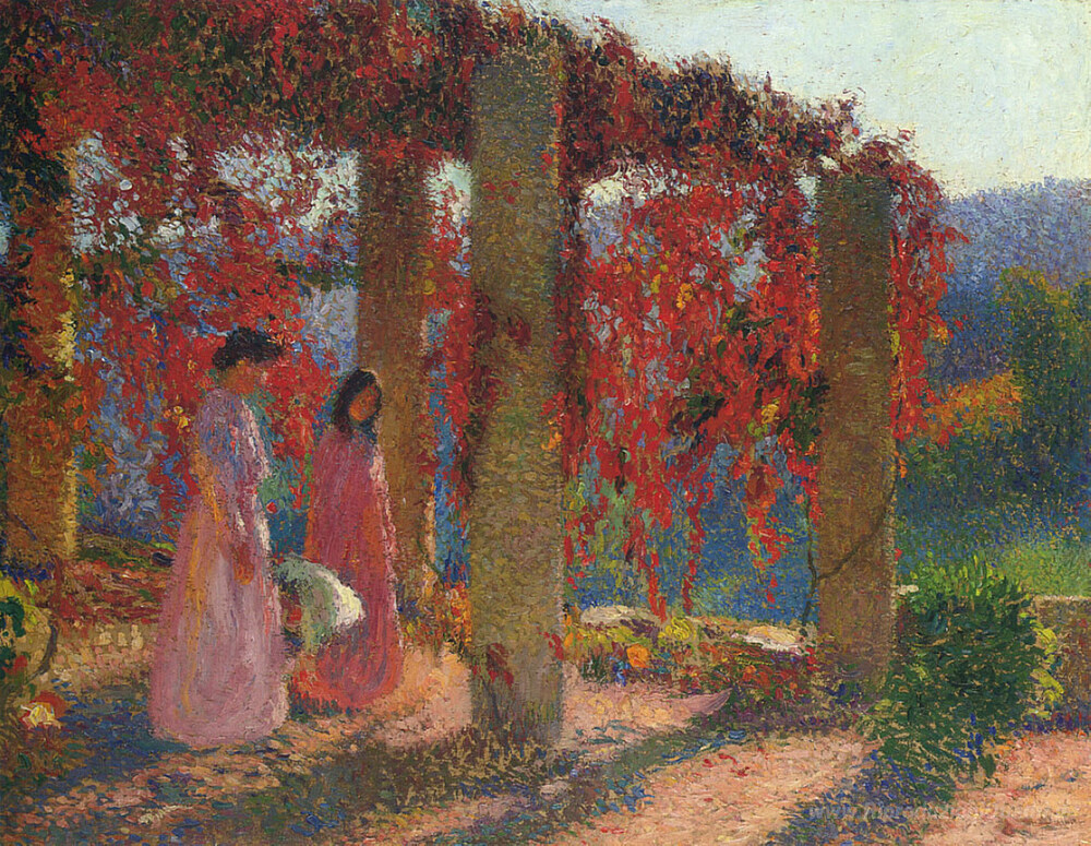 Ti offriamo una riproduzione artigianale su tela dell'opera famosa 'Giovani donne in Tonnelle' di Henri Martin, dal Museo delle Riproduzioni.