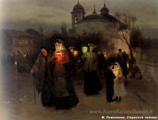 Ti offriamo una riproduzione artigianale su tela dell'opera famosa 'giovedì Santo' di Mykola Pymonenko, dal Museo delle Riproduzioni.