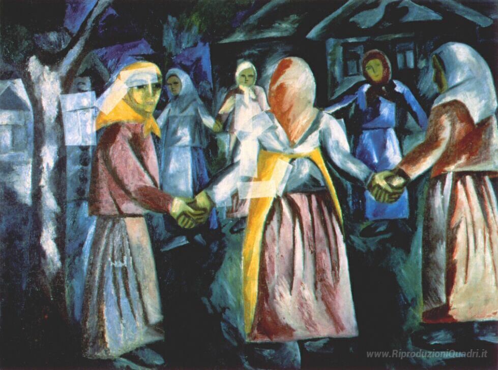 Ti offriamo una riproduzione artigianale su tela dell'opera famosa 'Girotondo' di Natalia Goncharova, dal Museo delle Riproduzioni.