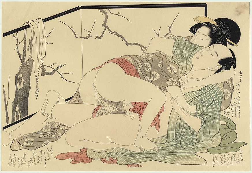 Ti offriamo una riproduzione artigianale su tela dell'opera famosa 'Gli amanti di fronte a uno schermo' di Kitagawa Utamaro, dal Museo delle Riproduzioni.