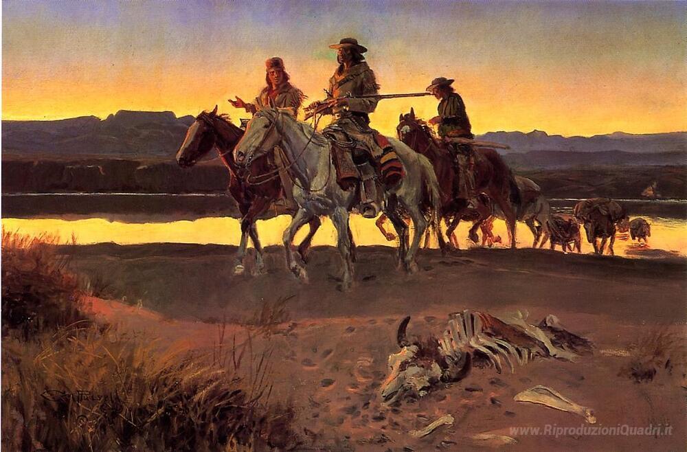 Ti offriamo una riproduzione artigianale su tela dell'opera famosa 'Gli uomini di Carson' di Charles M. Russell, dal Museo delle Riproduzioni.