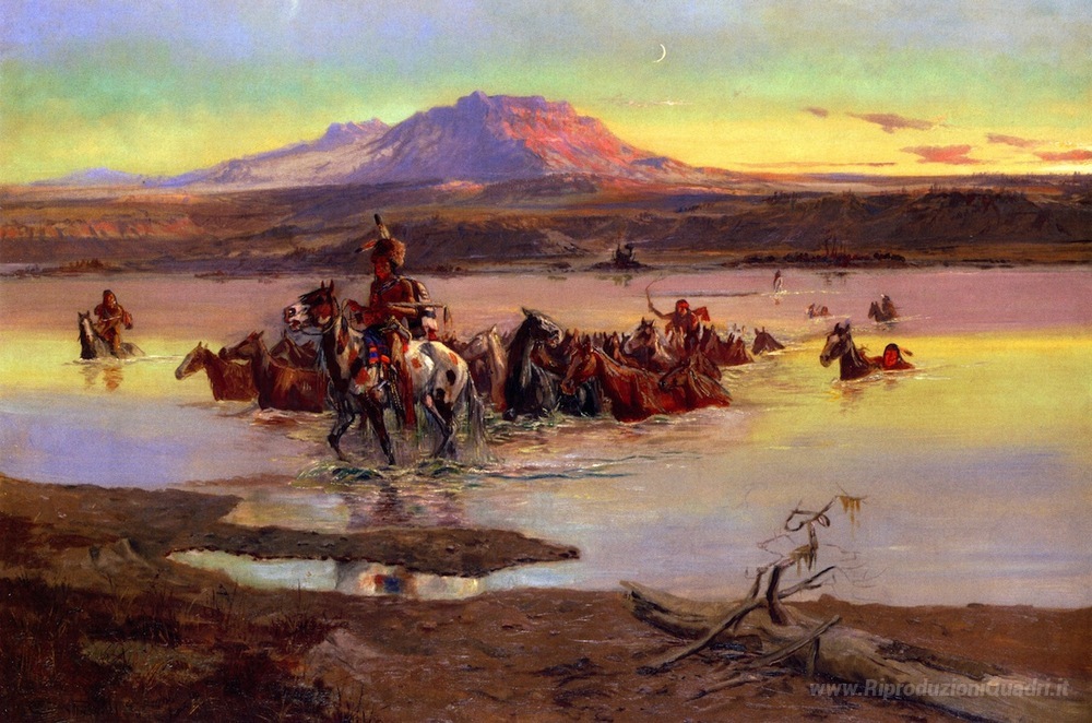 Ti offriamo una riproduzione artigianale su tela dell'opera famosa 'Guadando il Horse Herd' di Charles M. Russell, dal Museo delle Riproduzioni.