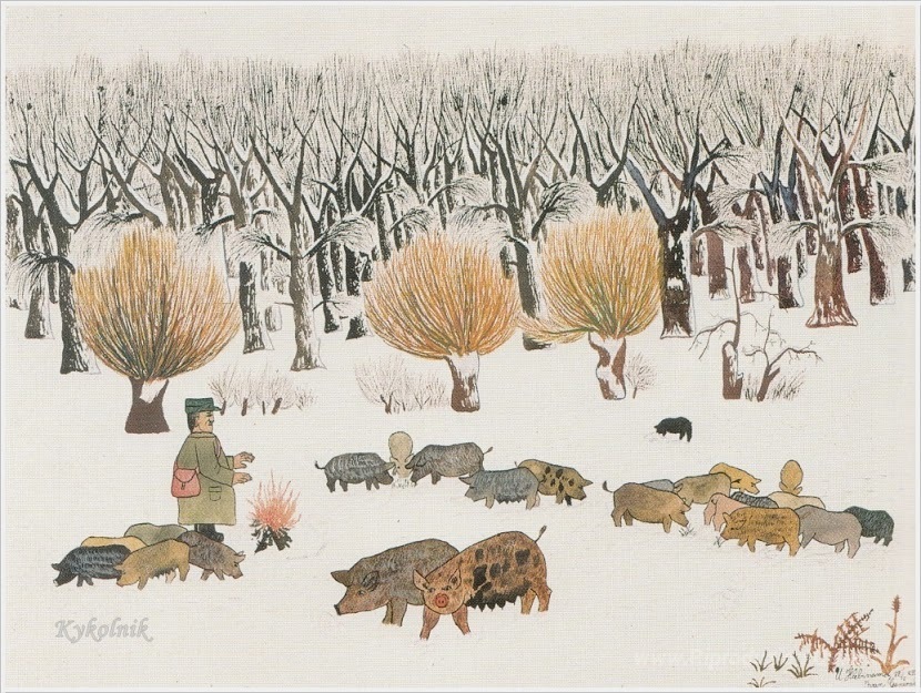 Ti offriamo una riproduzione artigianale su tela dell'opera famosa 'Guardando oltre i maiali' di Ivan Generalic, dal Museo delle Riproduzioni.