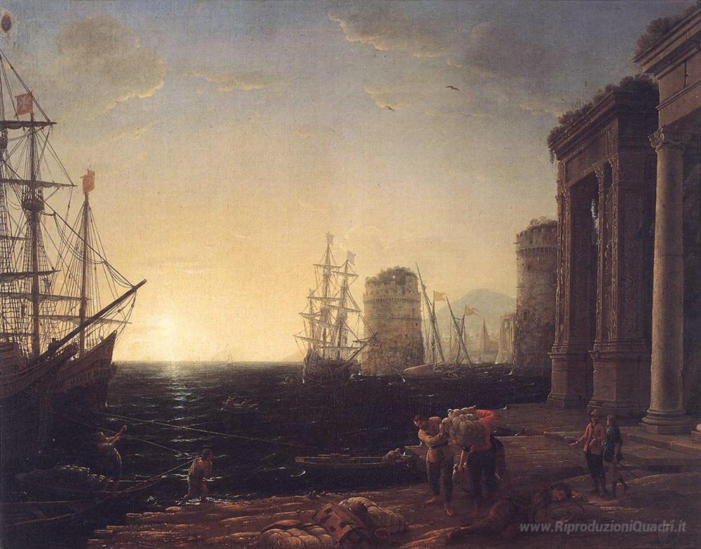 Ti offriamo una riproduzione artigianale su tela dell'opera famosa 'Harbour Scene at Sunset' di Claude Lorrain, dal Museo delle Riproduzioni.